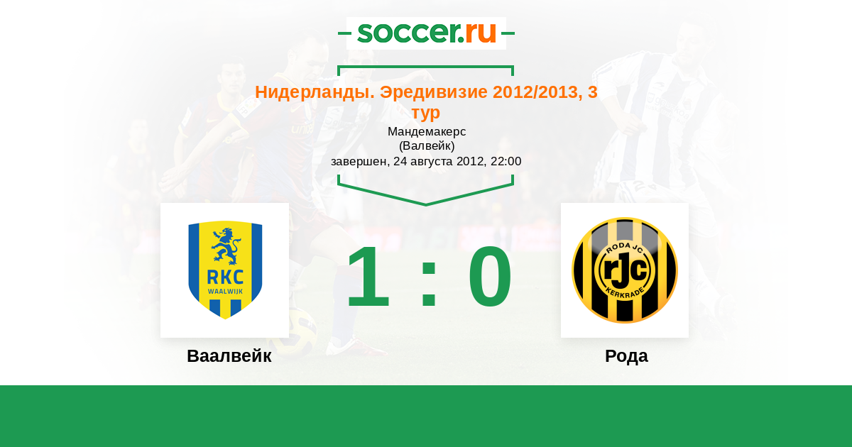 Нидерланды. Эредивизи 27.04.2013 Рода Логотип футбольный клуб Рода (Керкраде) 3:1 Логотип футбольный клуб Ваалвейк (Валвейк) Ваалвейк