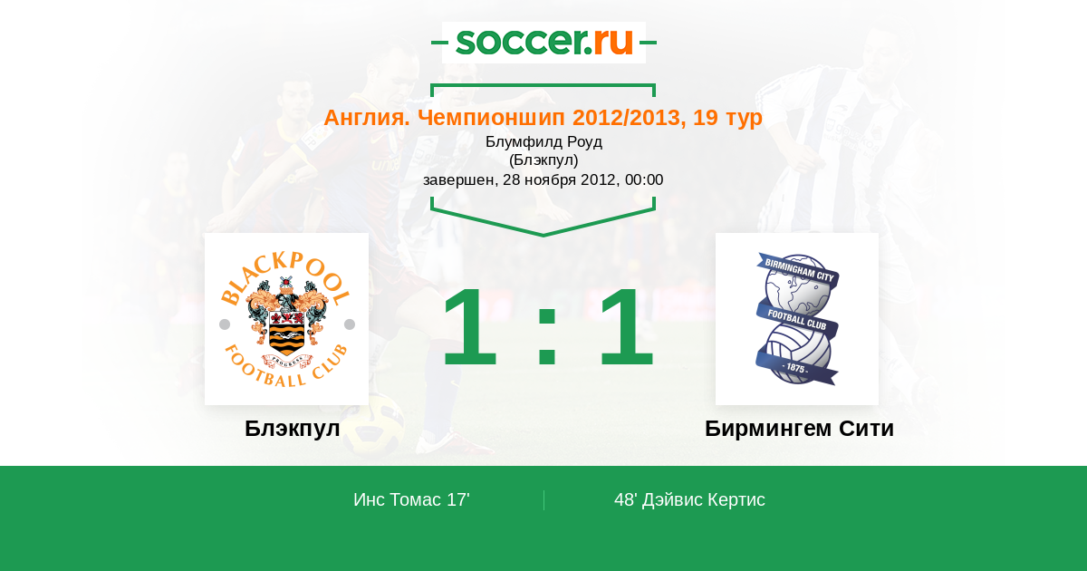 Англия. Чемпионшип 26.11.2011 Блэкпул Логотип футбольный клуб Блэкпул 2:2 Логотип футбольный клуб Бирмингем Сити Бирмингем Сити