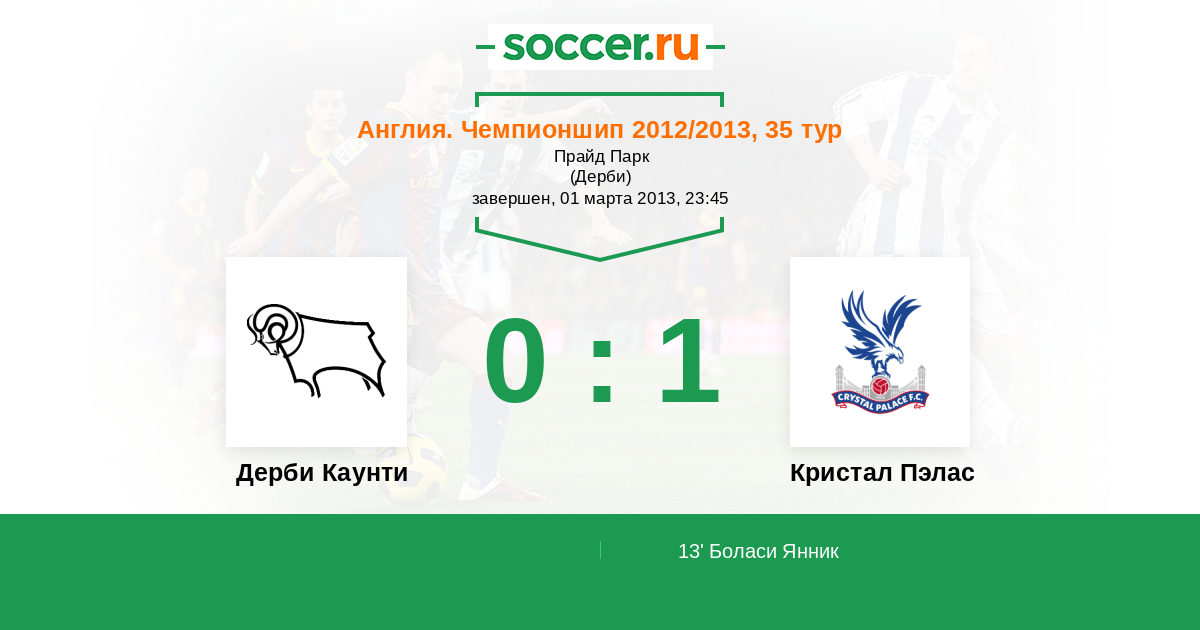 Англия. Чемпионшип 17.11.2012 Кристал Пэлас Логотип футбольный клуб Кристал Пэлас (Лондон) 3:0 Логотип футбольный клуб Дерби Каунти Дерби Каунти