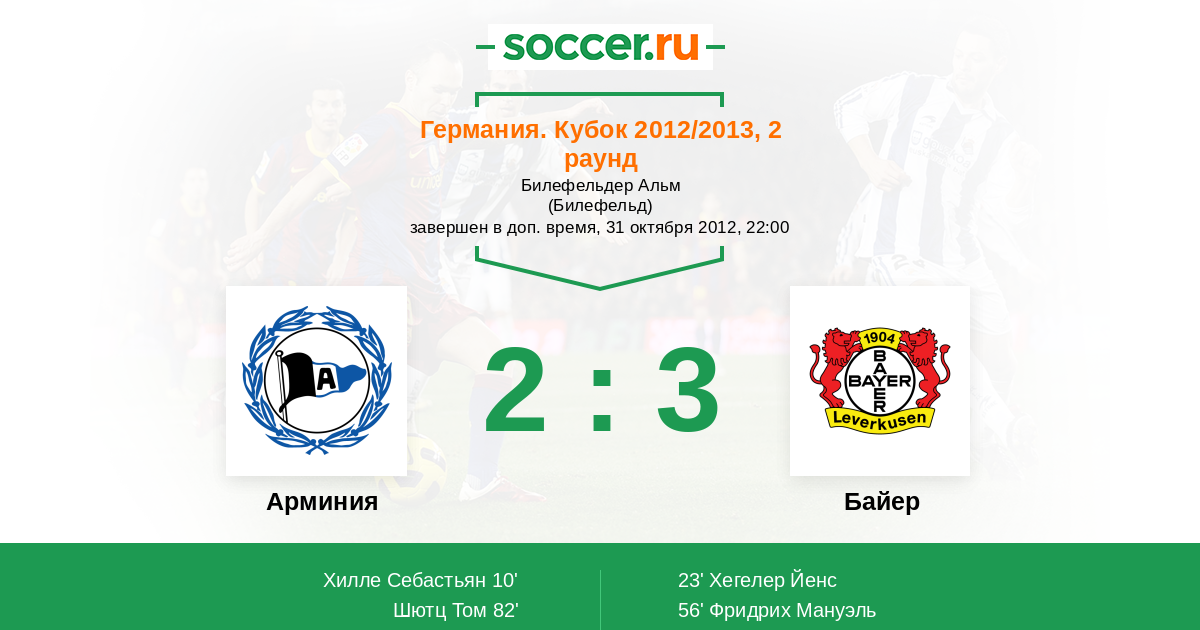 Германия. Кубок 24.09.2013 Арминия Логотип футбольный клуб Арминия (Билефельд) 0:2 Логотип футбольный клуб Байер (Леверкузен) Байер