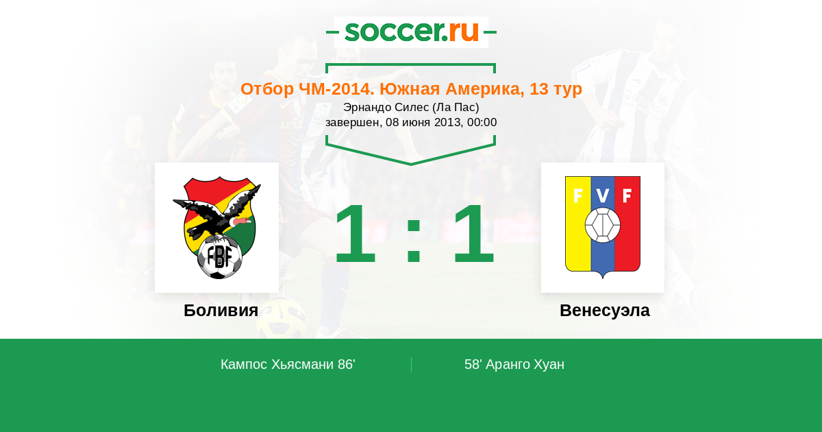 Товарищеские матчи. Сборные 15.08.2013 Венесуэла Логотип Венесуэла 2:2 Логотип Боливия Боливия