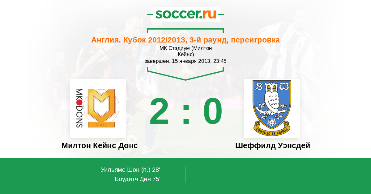 Англия. Кубок 05.01.2013 Шеффилд Уэнсдей Логотип футбольный клуб Шеффилд Уэнсдей 0:0 Логотип футбольный клуб Милтон Кейнс Донс Милтон Кейнс Донс