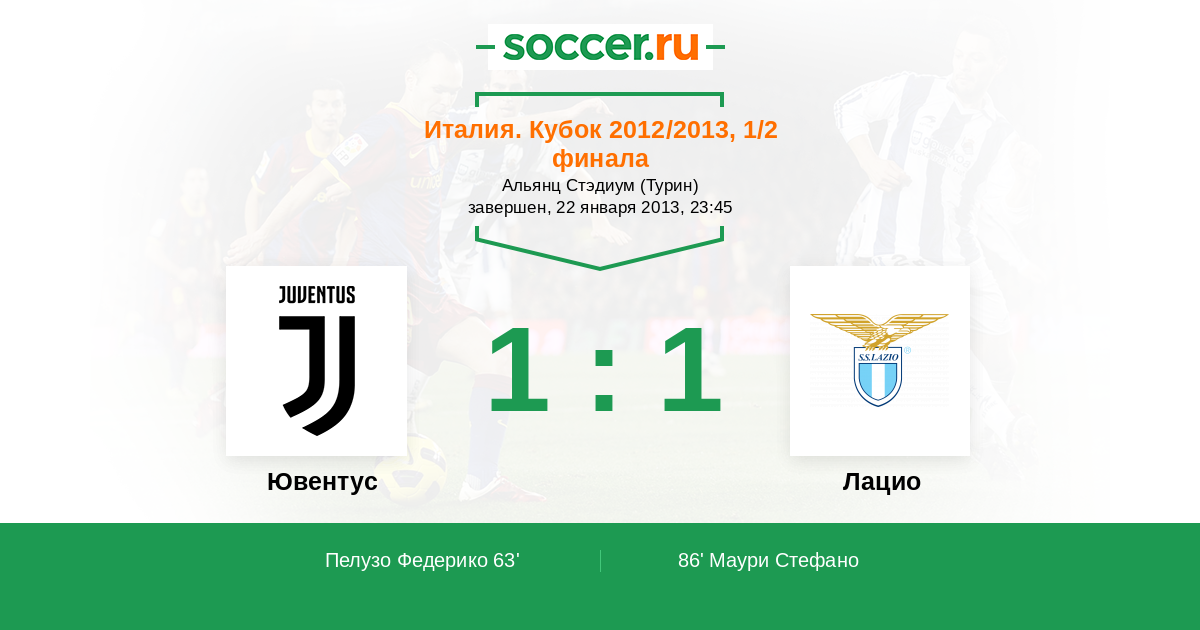 Италия. Кубок 29.01.2013 Лацио Логотип футбольный клуб Лацио (Рим) 2:1 Логотип футбольный клуб Ювентус (Турин) Ювентус