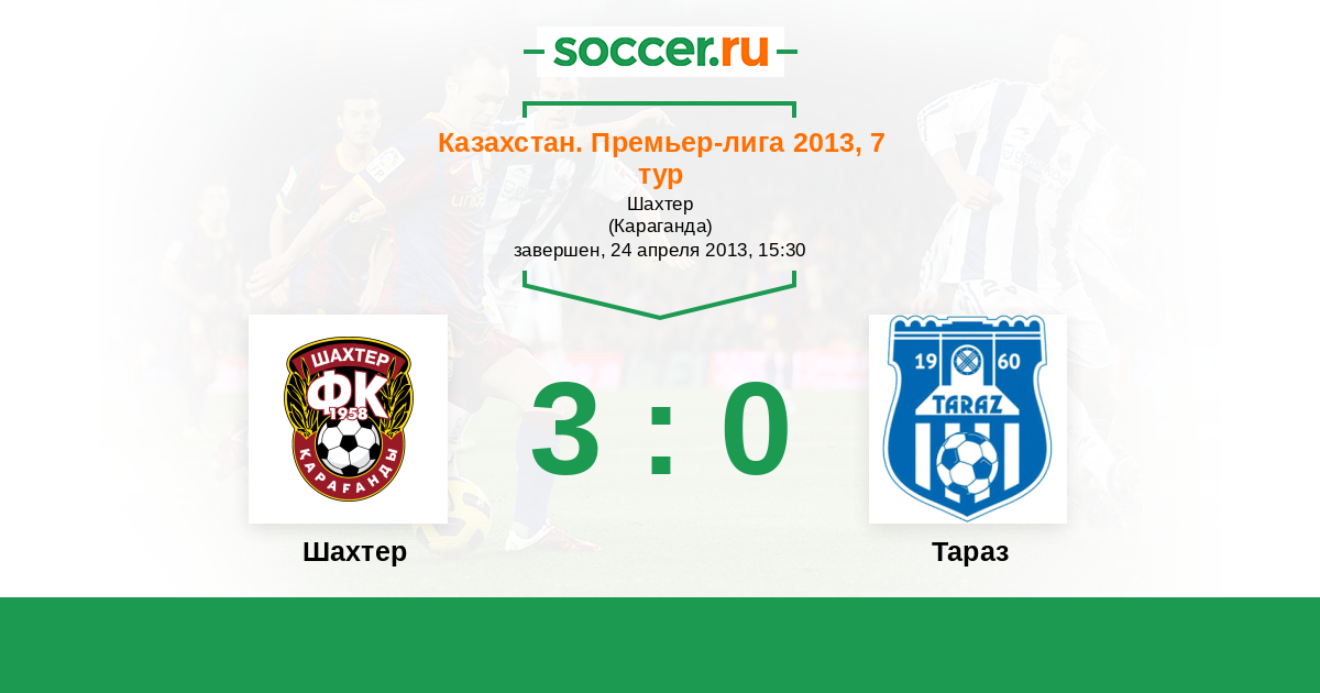 Казахстан. Премьер-лига 15.04.2012 Шахтер Логотип футбольный клуб Шахтер (Караганда) 1:0 Логотип футбольный клуб Тараз Тараз