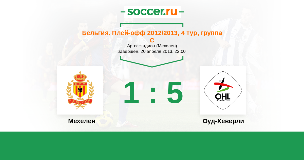 Бельгия. Про-Лига 13.04.2013 Оуд-Хеверли Логотип футбольный клуб Оуд-Хеверли (Левен) 0:3 Логотип футбольный клуб Мехелен Мехелен