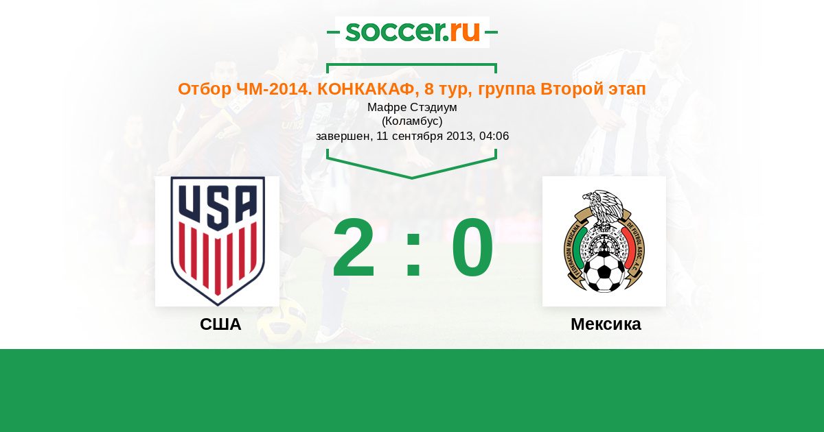 Отбор ЧМ. КОНКАКАФ 27.03.2013 Мексика Логотип Мексика 0:0 Логотип США США