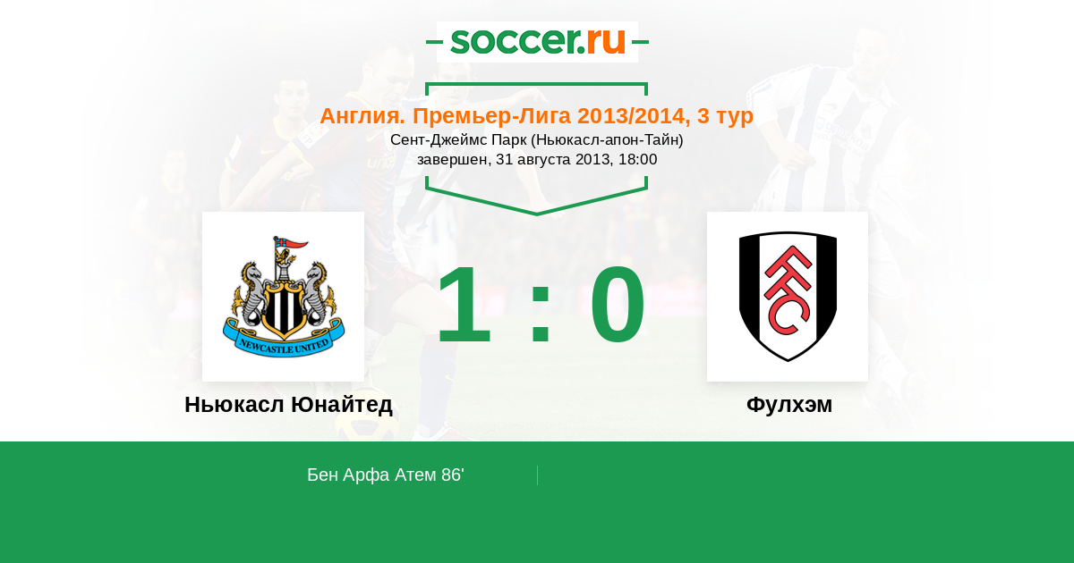 Англия. Премьер-Лига 07.04.2013 Ньюкасл Юнайтед Логотип футбольный клуб Ньюкасл Юнайтед (Ньюкасл-апон-Тайн) 1:0 Логотип футбольный клуб Фулхэм (Лондон) Фулхэм