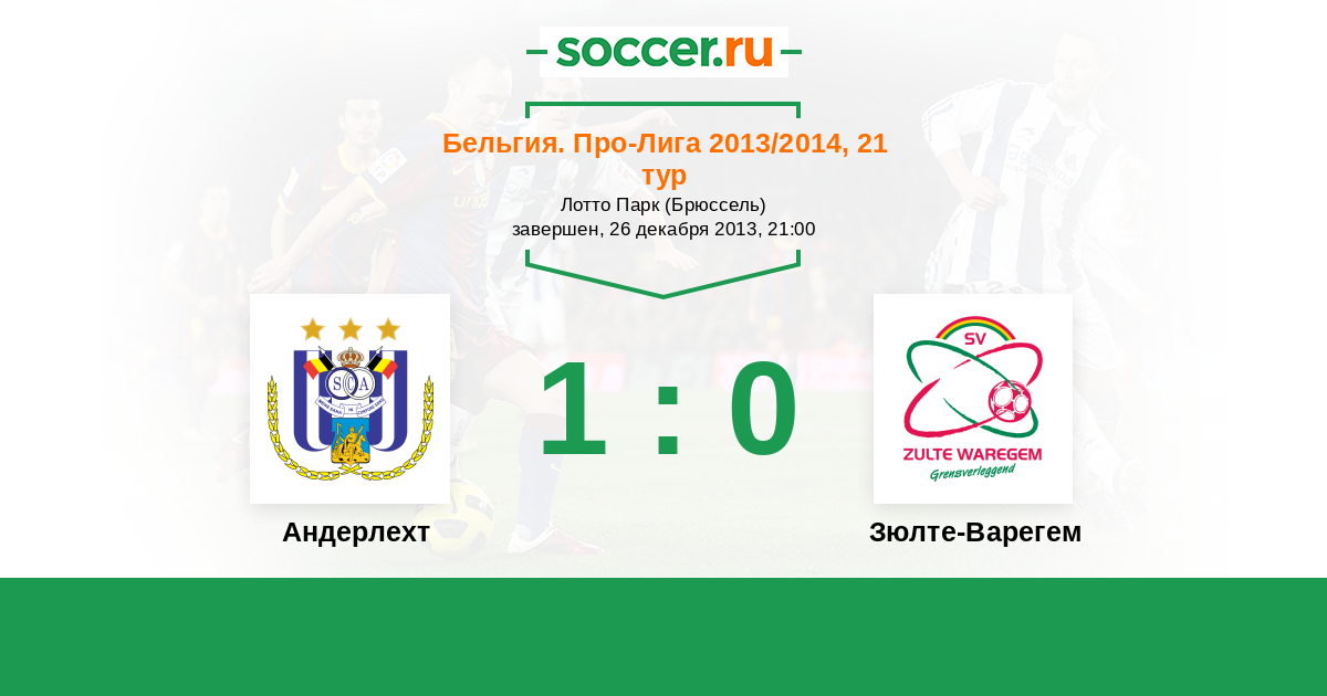 Бельгия. Про-Лига 27.09.2014 Зюлте-Варегем Логотип футбольный клуб Зюлте-Варегем 0:2 Логотип футбольный клуб Андерлехт (Брюссель) Андерлехт