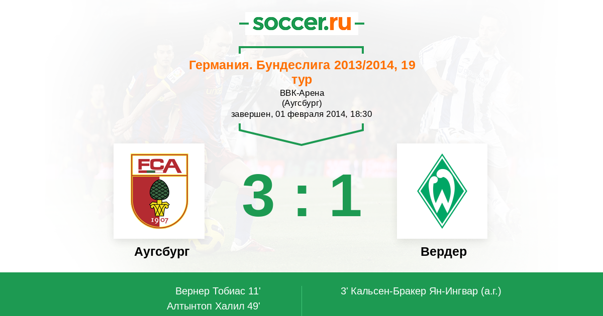 Германия. Бундеслига 17.08.2013 Вердер Логотип футбольный клуб Вердер (Бремен) 1:0 Логотип футбольный клуб Аугсбург Аугсбург