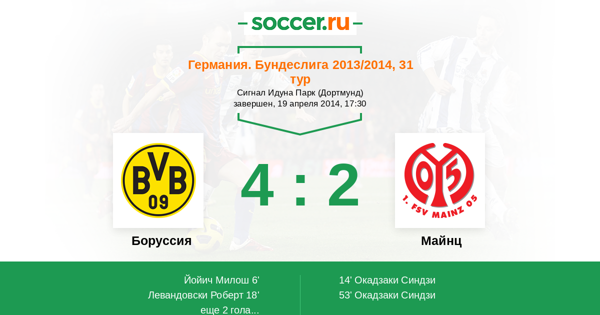 Германия. Бундеслига 20.04.2013 Боруссия Логотип футбольный клуб Боруссия (Дортмунд) 2:0 Логотип футбольный клуб Майнц Майнц