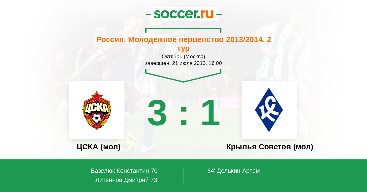 Россия. Премьер-Лига U21 04.04.2014 Крылья Советов (мол) Логотип футбольный клуб Крылья Советов (мол) (Самара) 2:3 Логотип футбольный клуб ЦСКА (мол) (Москва) ЦСКА (мол)