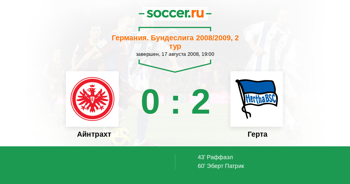 Германия. Бундеслига 11.08.2007 Айнтрахт Логотип футбольный клуб Айнтрахт (Франкфурт) 1:0 Логотип футбольный клуб Герта (Берлин) Герта