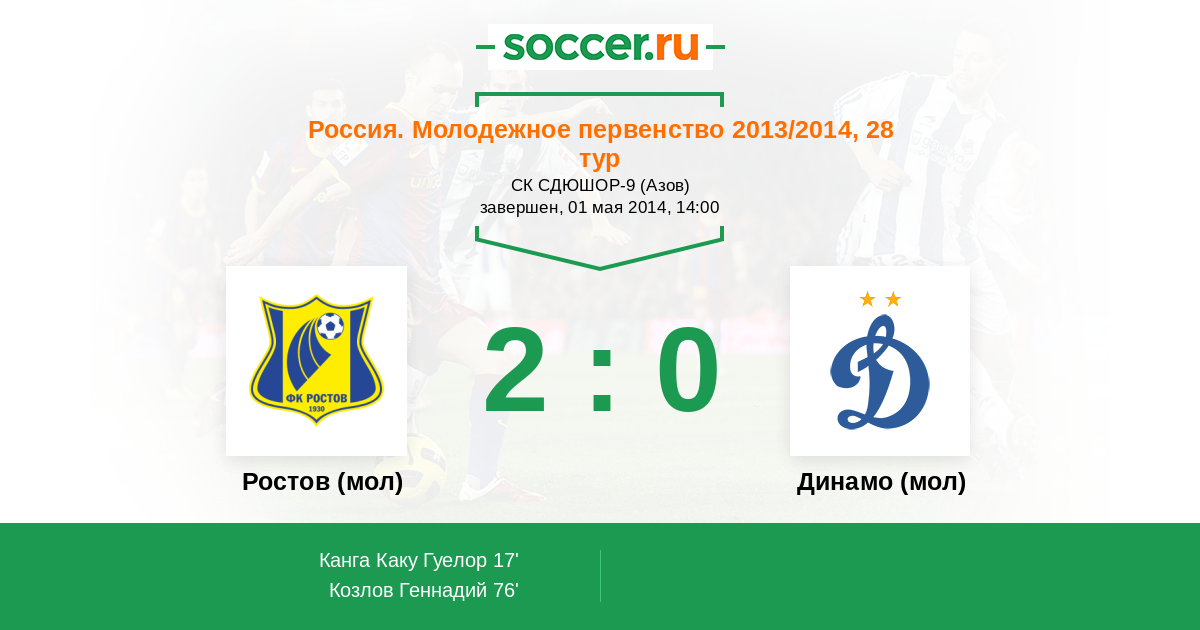 Россия. Премьер-Лига U21 02.08.2014 Динамо (мол) Логотип футбольный клуб Динамо (мол) (Москва) 3:2 Логотип футбольный клуб Ростов (мол) (Ростов-на-Дону) Ростов (мол)