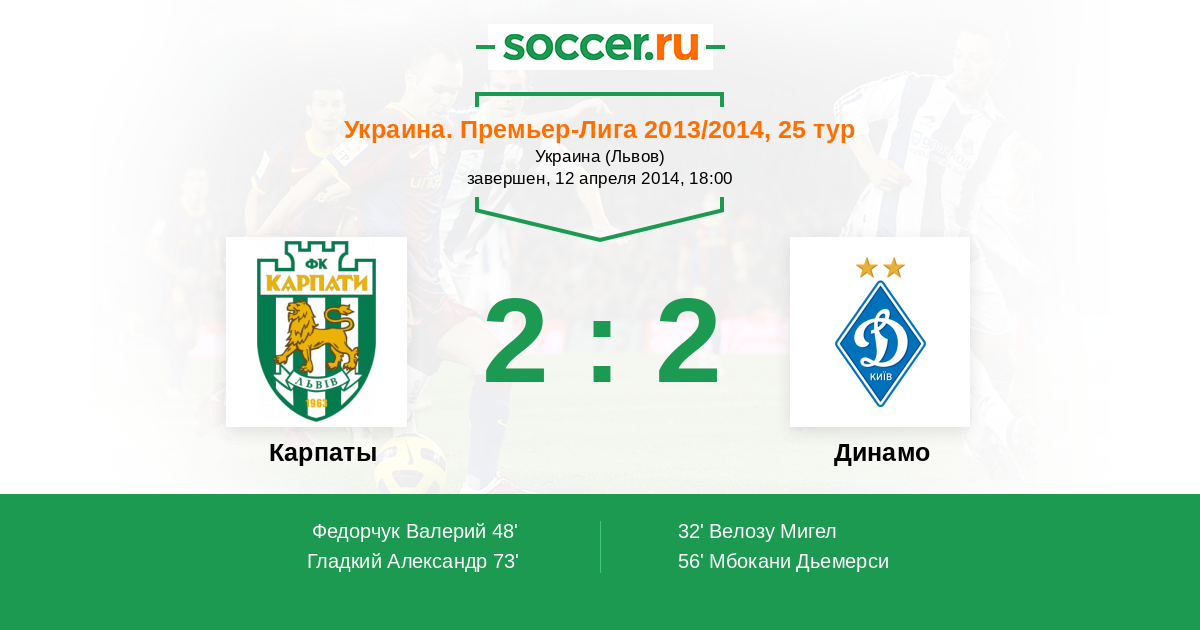 Украина. Премьер-Лига 13.04.2013 Карпаты Логотип футбольный клуб Карпаты (Львов) 0:1 Логотип футбольный клуб Динамо (Киев) Динамо