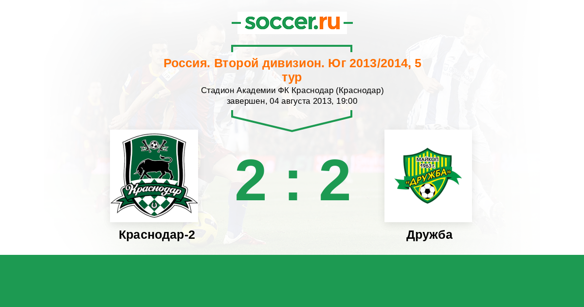 Россия. Вторая лига. Группа 1 26.08.2014 Краснодар-2 Логотип футбольный клуб Краснодар-2 3:1 Логотип футбольный клуб Дружба (Майкоп) Дружба