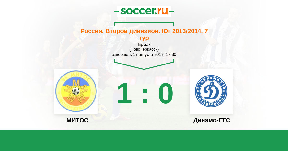 Россия. Вторая лига. Группа 1 13.10.2014 Динамо-ГТС Логотип футбольный клуб Динамо-ГТС (Ставрополь) 1:4 Логотип футбольный клуб МИТОС (Новочеркасск) МИТОС