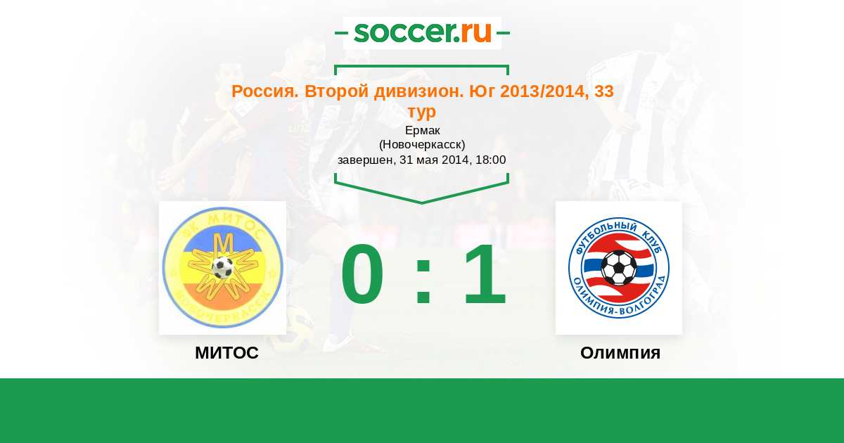 Россия. Вторая лига. Группа 1 31.05.2014 МИТОС Логотип футбольный клуб МИТОС (Новочеркасск) 0:1 Логотип футбольный клуб Олимпия (Волгоград) Олимпия