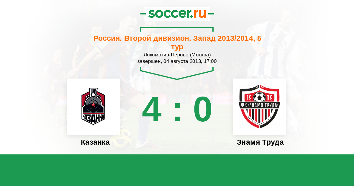 Россия. Вторая лига. Группа 2 23.08.2019 Казанка Логотип футбольный клуб Казанка (Москва) 1:1 Логотип футбольный клуб Знамя Труда (Орехово-Зуево) Знамя Труда