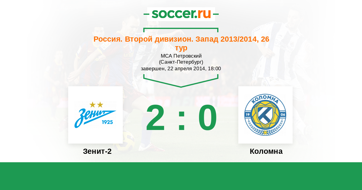 Россия. Вторая лига. Группа 2 17.10.2014 Зенит-2 Логотип футбольный клуб Зенит-2 (Санкт-Петербург) 2:0 Логотип футбольный клуб Коломна Коломна