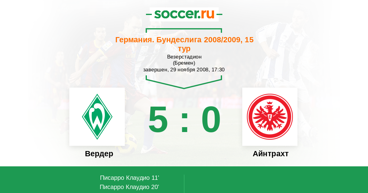 Германия. Бундеслига 13.05.2009 Айнтрахт Логотип футбольный клуб Айнтрахт (Франкфурт) 0:5 Логотип футбольный клуб Вердер (Бремен) Вердер