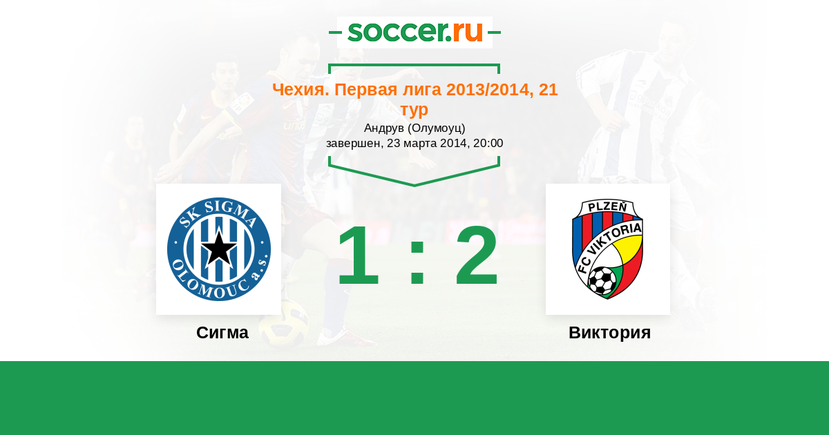 Чехия. Первая Лига 22.05.2013 Сигма Логотип футбольный клуб Сигма (Оломоуц) 0:1 Логотип футбольный клуб Виктория (Пльзень) Виктория