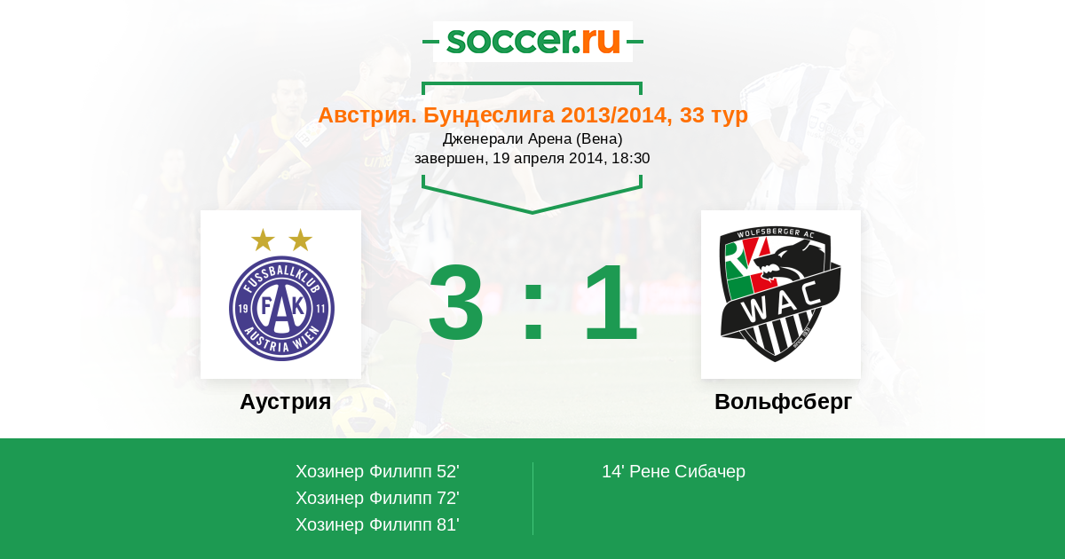 Австрия. Бундеслига 06.04.2013 Аустрия Логотип футбольный клуб Аустрия (Вена) 0:4 Логотип футбольный клуб Вольфсберг Вольфсберг