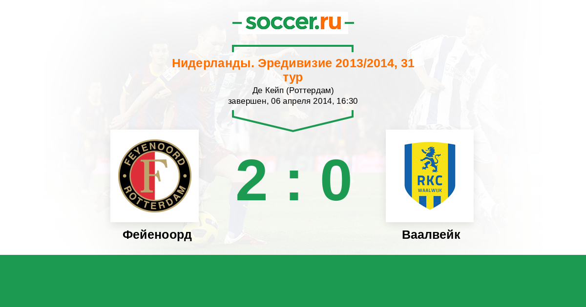 Нидерланды. Эредивизи 14.04.2013 Ваалвейк Логотип футбольный клуб Ваалвейк (Валвейк) 1:1 Логотип футбольный клуб Фейеноорд (Роттердам) Фейеноорд
