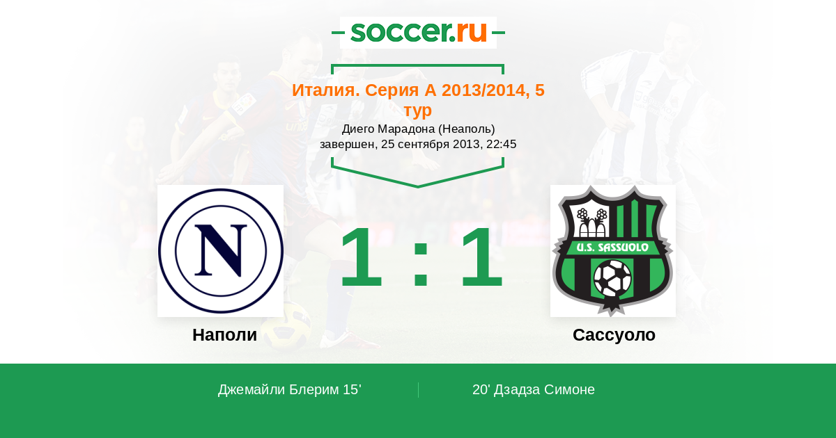 Италия. Серия А 28.09.2014 Сассуоло Логотип футбольный клуб Сассуоло 0:1 Логотип футбольный клуб Наполи (Неаполь) Наполи