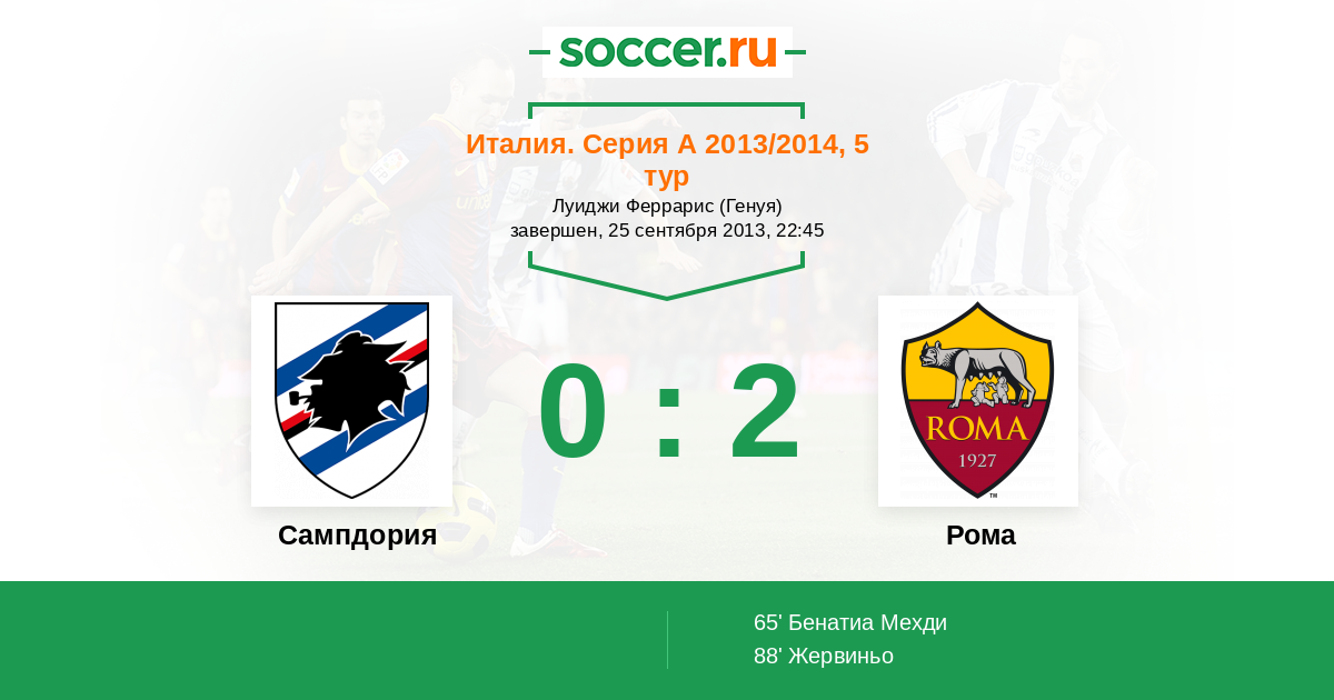 Италия. Серия А 16.02.2014 Рома Логотип футбольный клуб Рома (Рим) 3:0 Логотип футбольный клуб Сампдория (Генуя) Сампдория