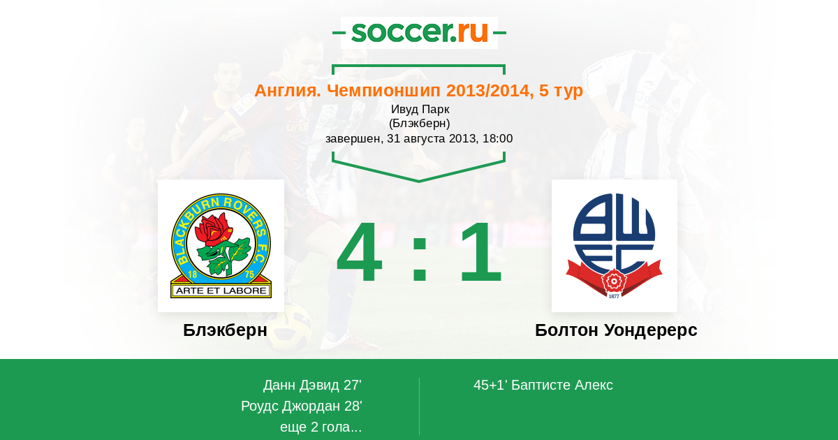 Англия. Чемпионшип 01.03.2014 Болтон Уондерерс Логотип футбольный клуб Болтон Уондерерс 4:0 Логотип футбольный клуб Блэкберн Блэкберн