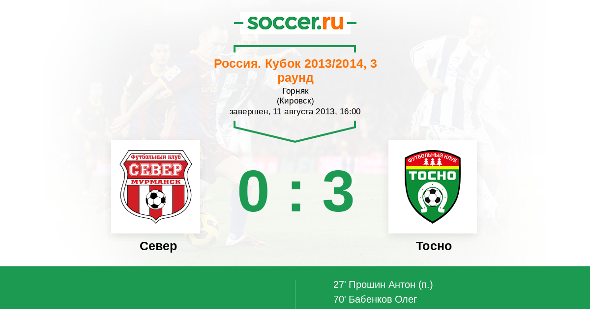 Россия. Вторая лига. Группа 2 04.09.2013 Север Логотип футбольный клуб Север (Мурманск) 0:0 Логотип футбольный клуб Тосно Тосно