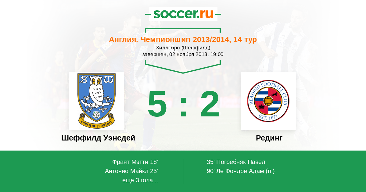 Англия. Чемпионшип 20.09.2014 Шеффилд Уэнсдей Логотип футбольный клуб Шеффилд Уэнсдей 1:0 Логотип футбольный клуб Рединг Рединг