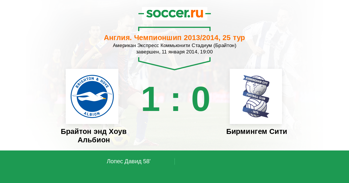 Англия. Чемпионшип 16.08.2014 Бирмингем Сити Логотип футбольный клуб Бирмингем Сити 1:0 Логотип футбольный клуб Брайтон энд Хоув Альбион Брайтон энд Хоув Альбион