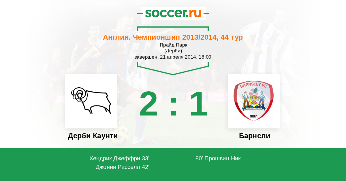 Англия. Чемпионшип 16.04.2013 Барнсли Логотип футбольный клуб Барнсли 1:1 Логотип футбольный клуб Дерби Каунти Дерби Каунти