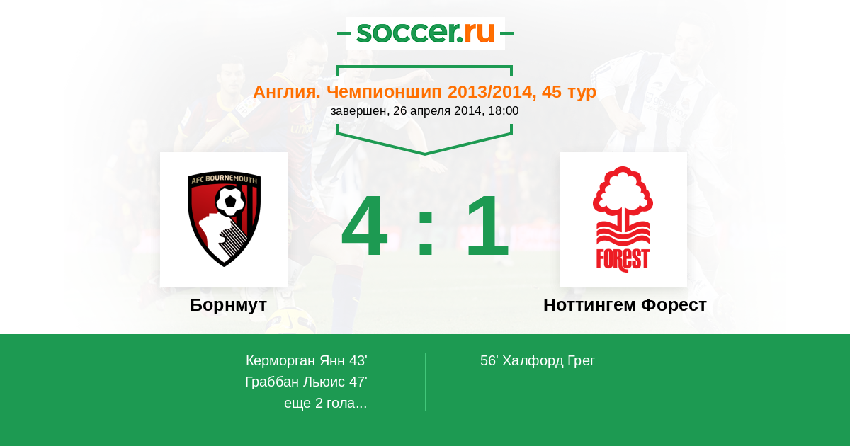 Англия. Чемпионшип 19.08.2014 Борнмут Логотип футбольный клуб Борнмут 1:2 Логотип футбольный клуб Ноттингем Форест Ноттингем Форест
