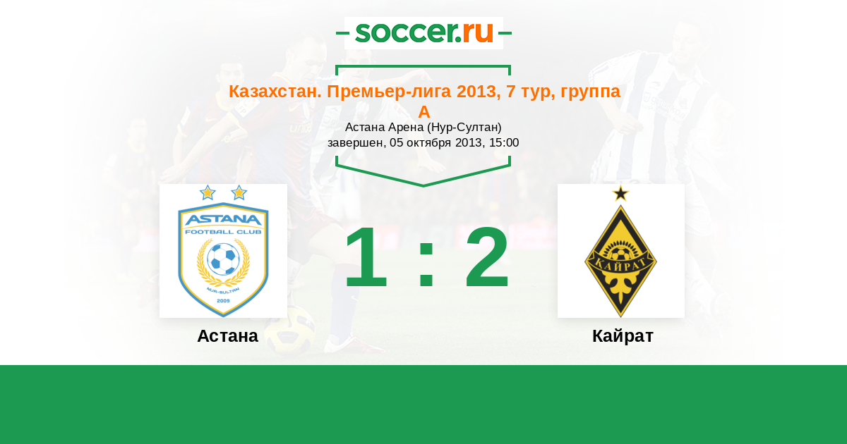 Казахстан. Премьер-лига 30.08.2013 Кайрат Логотип футбольный клуб Кайрат (Алматы) 1:2 Логотип футбольный клуб Астана Астана