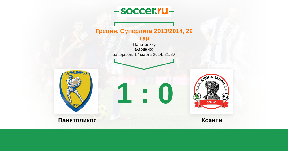 Греция. Суперлига 02.11.2014 Панетоликос Логотип футбольный клуб Панетоликос (Агринио) 5:2 Логотип футбольный клуб Ксанти Ксанти