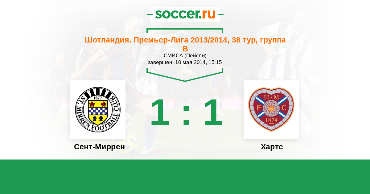 Шотландия. Премьер-Лига 04.05.2013 Хартс Логотип футбольный клуб Хартс (Эдинбург) 3:0 Логотип футбольный клуб Сент-Миррен (Пейсли) Сент-Миррен