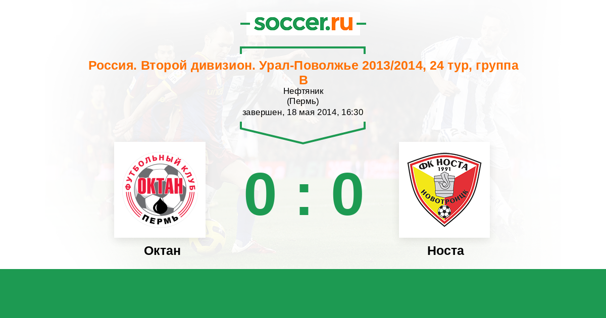 Россия. Вторая лига. Группа 4 18.05.2014 Октан Логотип футбольный клуб Октан (Пермь) 0:0 Логотип футбольный клуб Носта (Новотроицк) Носта