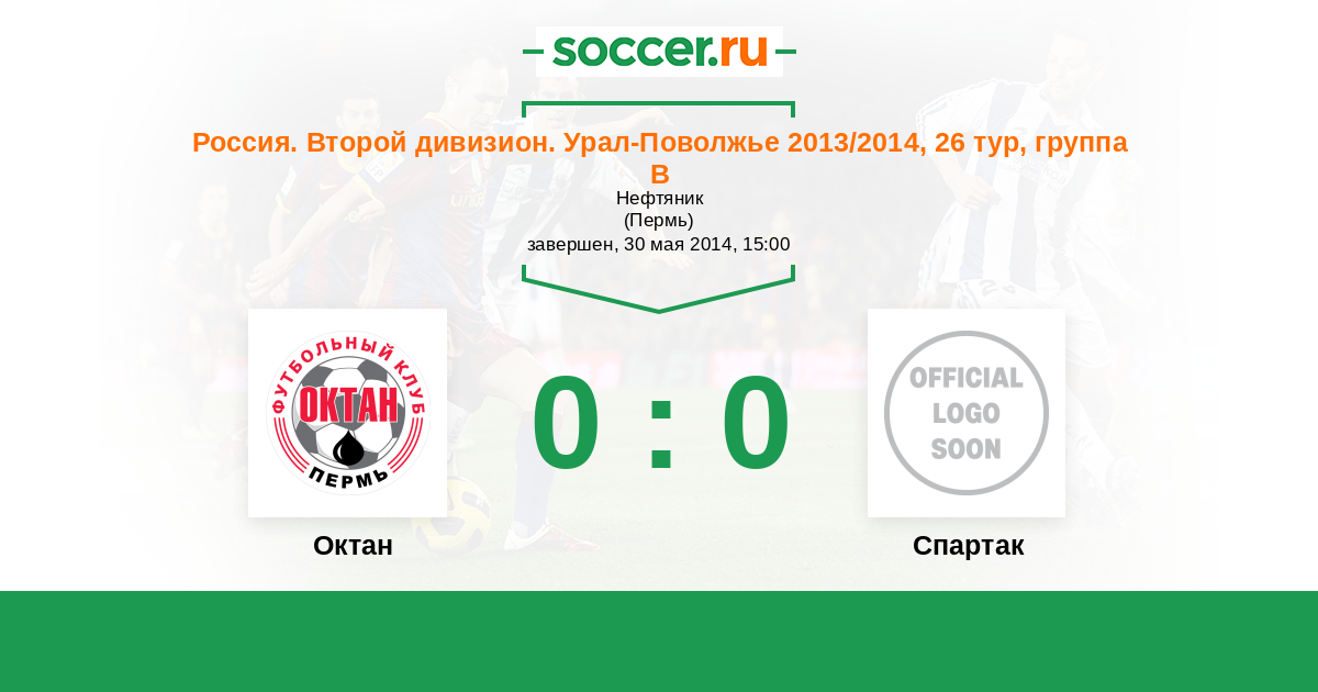 Россия. Вторая лига. Группа 4 30.05.2014 Октан Логотип футбольный клуб Октан (Пермь) 0:0 Логотип футбольный клуб Спартак (Йошкар-Ола) Спартак