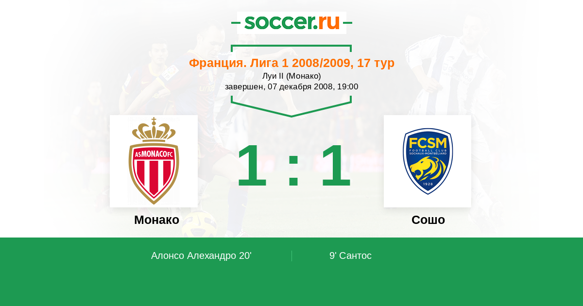 Франция. Лига 1 29.08.2009 Сошо Логотип футбольный клуб Сошо (Монбельяр) 1:0 Логотип футбольный клуб Монако Монако