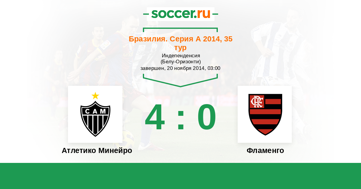 Бразилия. Кубок 30.10.2014 Фламенго Логотип футбольный клуб Фламенго (Рио-де-Жанейро) 2:0 Логотип футбольный клуб Атлетико Минейро (Белу-Оризонти) Атлетико Минейро