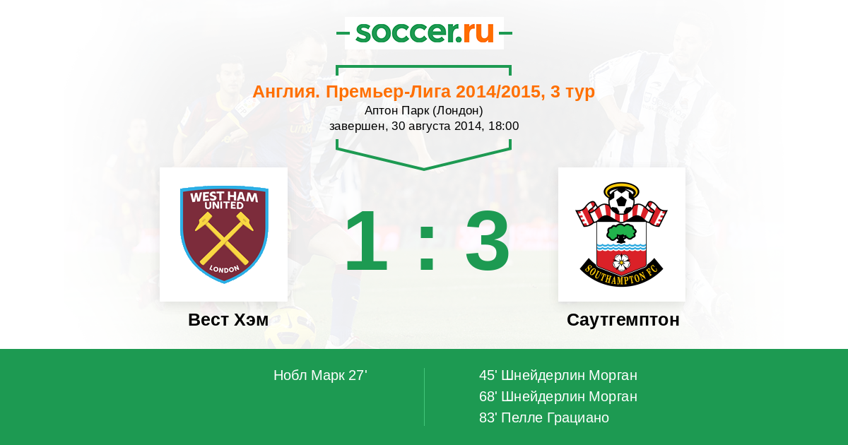 Англия. Премьер-Лига 15.09.2013 Саутгемптон Логотип футбольный клуб Саутгемптон 0:0 Логотип футбольный клуб Вест Хэм (Лондон) Вест Хэм