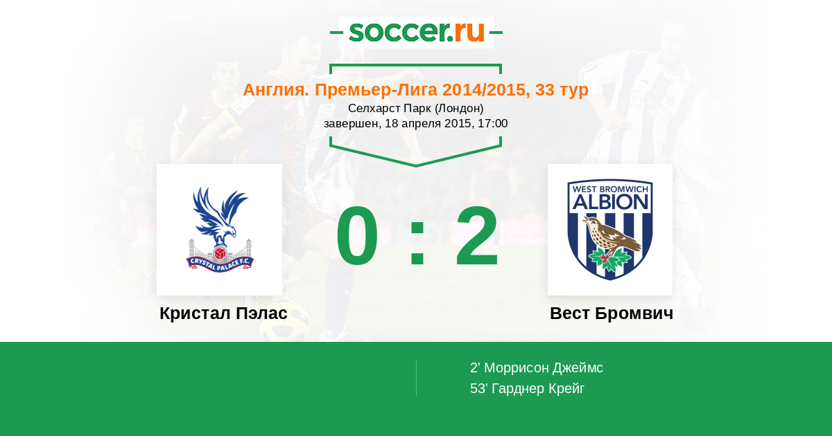 Англия. Премьер-Лига 25.10.2014 Вест Бромвич Логотип футбольный клуб Вест Бромвич 2:2 Логотип футбольный клуб Кристал Пэлас (Лондон) Кристал Пэлас