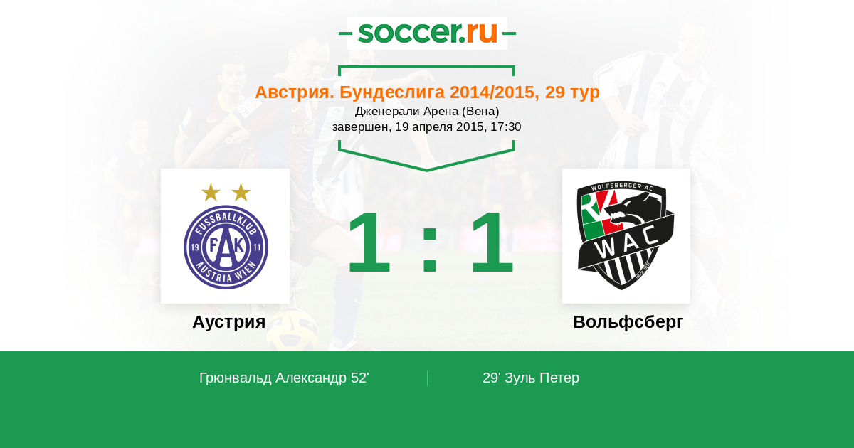 Австрия. Кубок 29.04.2015 Вольфсберг Логотип футбольный клуб Вольфсберг 0:3 Логотип футбольный клуб Аустрия (Вена) Аустрия