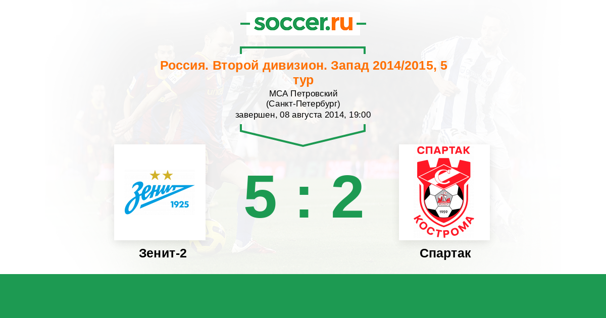 Россия. Вторая лига. Группа 2 28.08.2013 Зенит-2 Логотип футбольный клуб Зенит-2 (Санкт-Петербург) 2:1 Логотип футбольный клуб Спартак Кострома Спартак Кострома