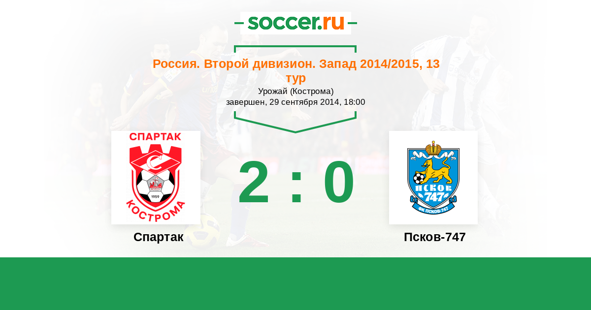 Россия. Вторая лига. Группа 2 21.09.2015 Псков-747 Логотип футбольный клуб Псков-747 3:1 Логотип футбольный клуб Спартак Кострома Спартак Кострома