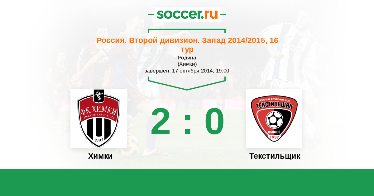 Россия. Вторая лига. Группа 2 11.10.2015 Текстильщик Логотип футбольный клуб Текстильщик (Иваново) 1:2 Логотип футбольный клуб Химки Химки