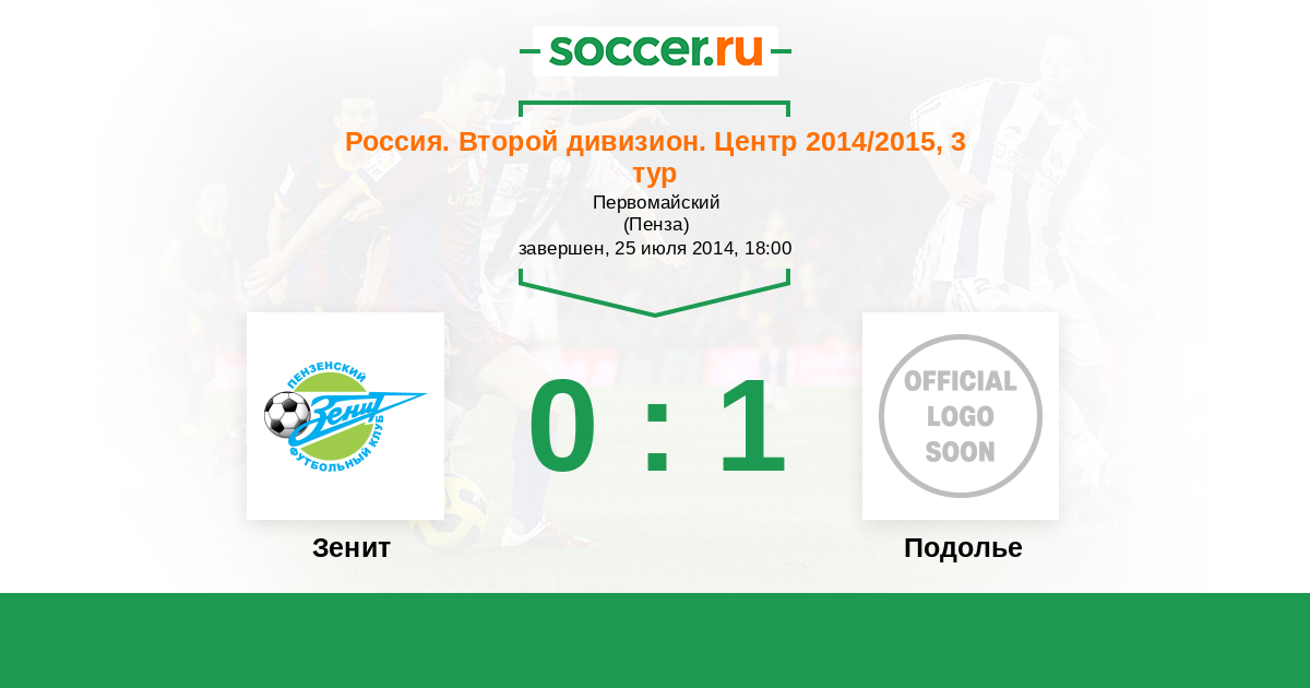 Россия. Вторая лига. Группа 3 30.05.2014 Подолье Логотип футбольный клуб Подолье (Подольский район) 2:1 Логотип футбольный клуб Зенит (Пенза) Зенит