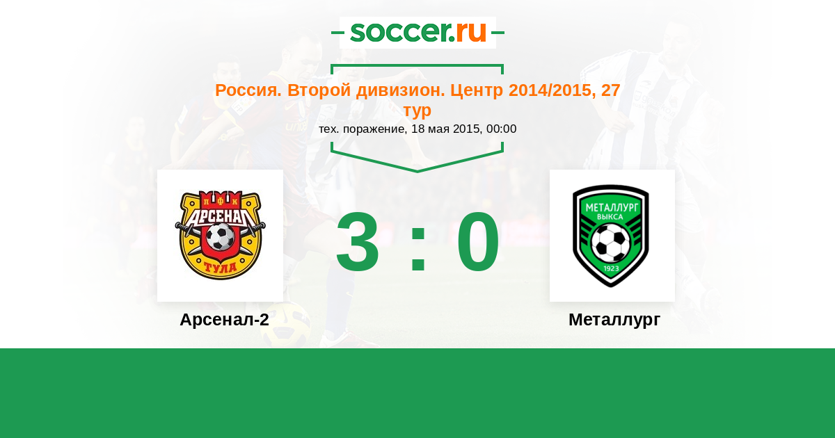 Россия. Вторая лига. Группа 3 18.05.2015 Арсенал-2 Логотип футбольный клуб Арсенал-2 (Тула) 3:0 Логотип футбольный клуб Металлург (Выкса) Металлург